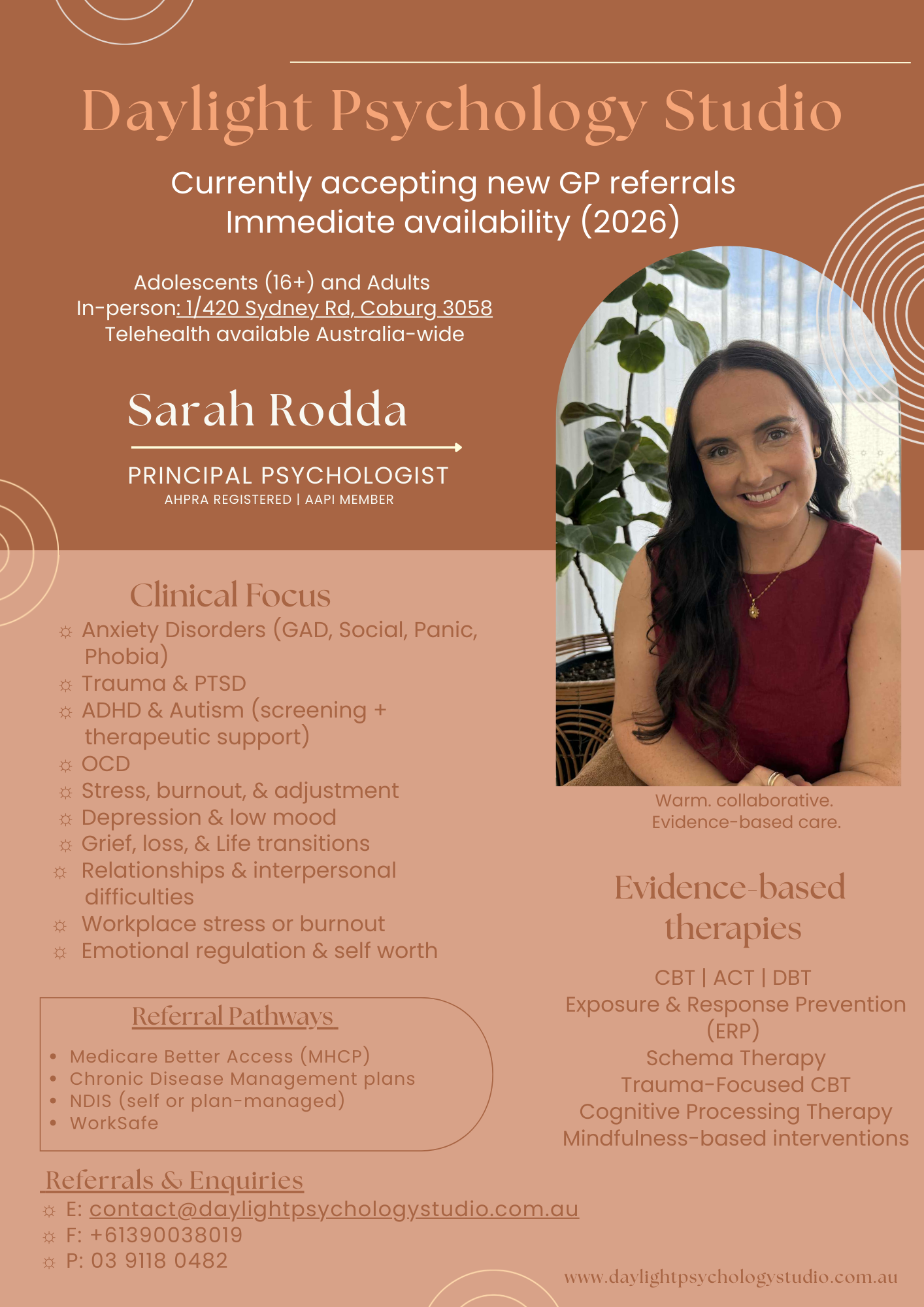 We offer Telehealth sessions Australia wide and in-person sessions from Coburg, Melbourne.